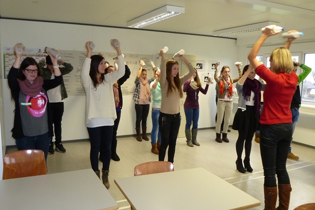 Die Klasse KfB 11 a erreichte mit ihrer Lehrerin, Studienrätin Veronika Graf, bayernweit den 1. Platz beim Kreativpreis, der mit 750,00 € dotiert war. Während der Projektdauer von vier Wochen begann die Klasse jeden Schultag mit verschiedenen 5-10-minütigen Übungen zur Rückengesundheit. „Es sind ganz einfache Übungen, ohne viel Aufwand, die man auch mal schnell in der Arbeit anwenden kann“, erklärte eine Schülerin. Die Übungen wurden vom jeweiligen Schüler-Trainerpaar zuhause vorbereitet und dann zusammen mit der ganzen Klasse durchgeführt. Dabei waren abwechselnd jeweils zwei Schüler als Fotograf aktiv. „Die Rückengymnastik war sehr abwechslungsreich, da sie sowohl im Stehen und Sitzen, als auch mit und ohne Hilfsmittel, wie z. B. Wasserflaschen, Stühlen oder Ordnern, stattfand“, so eine Teilnehmerin. Es wurden auch Partnerübungen gemacht. Die Trainingseinheiten bestanden aus Dehn-, Ausdauer- und Kräftigungsübungen. Während der vier aktiven Wochen wurden die Übungen in einer Fotodokumentation und einem Video zusammengefasst sowie im Anschluss mit Musik hinterlegt. Außerdem verfasste die Klasse einen Bericht über die Planung, Durchführung und Reflexion des Projekts. Die Klasse ist dem Projekt sehr offen gegenüber getreten: „Durch die morgendlichen Übungen wurden wir wach und hatten gleich noch Spaß. Unsere Klassengemeinschaft wurde noch besser“. Zudem hat die Aktion auch im Büroalltag der Auszubildenden einen Platz gefunden. Im Fall von Rückenschmerzen haben die Schüler nun immer die passenden Übungen parat. Eine Schülerin meinte: „Wer hätte das gedacht, dass ein ganz normaler Schulordner oder eine Wasserflasche unserem Rücken so gut tun können?“