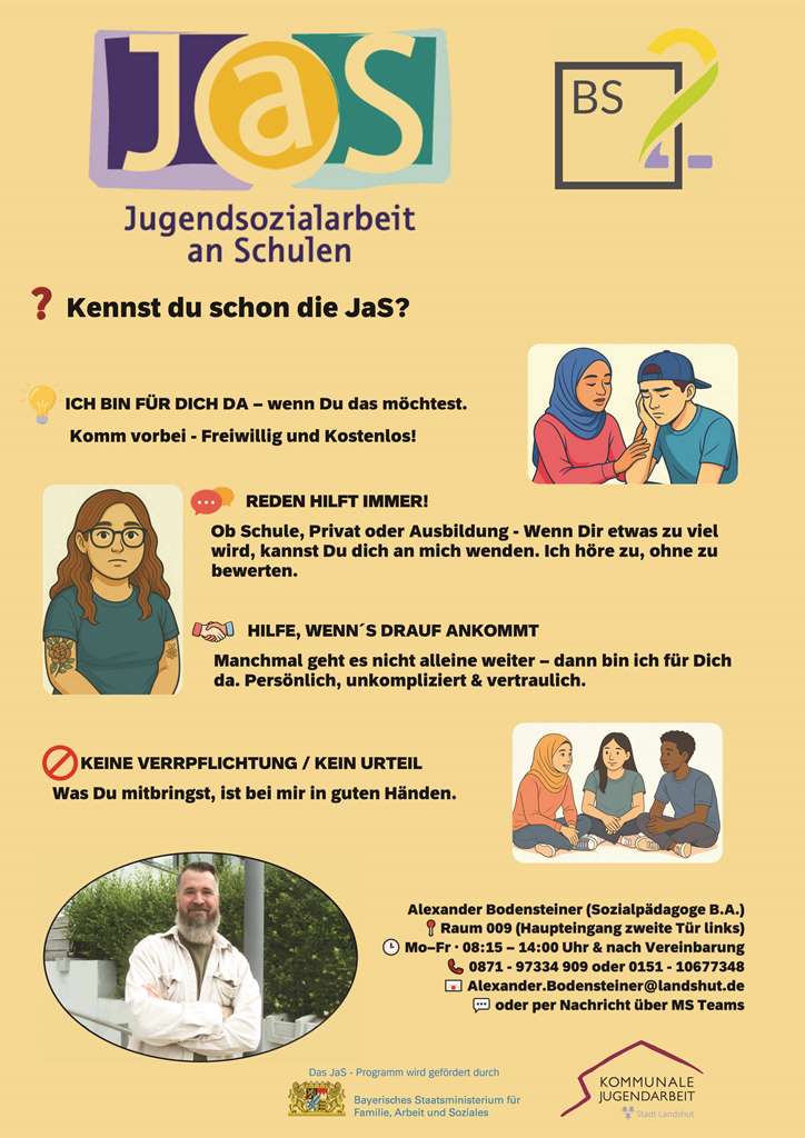Die sozialpädagogische Beratung an unserer Schule ist ein Angebot der Jugendsozialarbeit an Schulen (JAS) und wird aus Mitteln des Bayerischen Staatsministeriums für Arbeit und Sozialordnung, Familie und Frauen gefördert. Dieses Angebot ist für unsere Schüler kostenlos und absolut vertraulich.