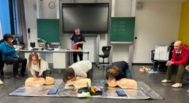 Gerade bei Verkehrsunfällen ist es jedoch wichtig, zunächst sich selbst zu schützen und den Unfallort korrekt abzusichern. An dieser Stelle wurden die Kursteilnehmer daran erinnert, wie viele Warnwesten man im eigenen Auto mit sich führen sollte, in welchem Abstand zum Unfallort das Warndreieck aufgestellt werden muss und dass der Verbandskasten im Auto im Übrigen nur ein begrenztes Haltbarkeitsdatum hat.