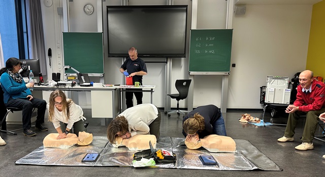 Natürlich kam auch der praktische Teil nicht zu kurz. Die Teilnehmenden durften unter anderem diverse Verbände und die stabile Seitenlage trainieren. Ein Highlight war sicherlich das Üben der Herzdruckmassage an dem Torso „Little Anne“. Die Puppe gibt nämlich via Tablet unmittelbar Rückmeldung über die Qualität der Herzdruckmassage - auch im Bereich der Ersten-Hilfe ist das Thema Digitalisierung präsent.