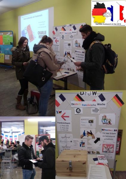 Alle Schüler konnten sich mit Hilfe einer PowerPoint-Präsentation im Eingangsbereich der Schule mit der historischen Entwicklung der deutsch-französischen Beziehungen und den aktuellen politischen Ereignissen in Paris und Berlin umfangreich auseinandersetzen. Besonders wissbegierige Schüler lösten das vom Frankreich-Team initiierte knifflige Quiz. Als Belohnung winkten den Gewinnern attraktive Geldpreise in Höhe von 50 € (1. Platz), 30 € (2. Platz) und 20 € (3. Platz). Herzliche Glückwünsche ergehen an Freund Marie, Horwath Jaqueline und Milena Schwingenschlögl aus den Klassen BM10d und MFA11b.