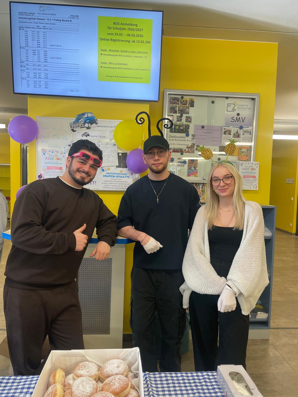 In der letzten Woche vor den Faschingsferien hieß es wieder "Helau" und die SMV veranstaltete erneut ein Krapfen-Roulette. Täglich wurden circa 50 Krapfen verkauft, wovon einer eine andere Füllung hatte und mit einem Kantinengutschein belohnt wurde – leider wurde dieser nicht an allen Tagen bemerkt. Vielleicht muss die SMV nächstes Jahr mit visuellen Hilfen zum Erkennen einer Aprikosen- oder Vanillefüllung nachhelfen. 😋