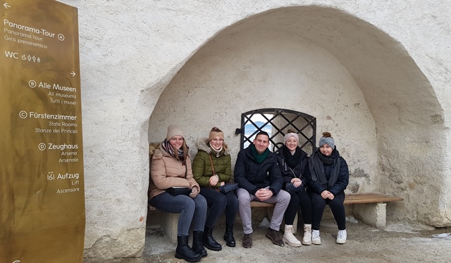 Nach einem ausgiebigen Frühstück machte sich die Gruppe am zweiten Tag auf zur Festung Hohensalzburg. Das erste Highlight des Tages war dabei die Fahrt mit der Festungsbahn. Bei dieser Standseilbahn auf den Festungsberg handelt es sich um die älteste in Betrieb befindliche Seilbahn dieser Art in Österreich. Oben angekommen konnten die Schülerinnen und Schüler die Festung alleine erkunden und die unterschiedlichen Ausblicke als Fotomotive für Selfies nutzen. Anschließend lernte die Reisegruppe während einer Führung die Geschichte sowie die Innenräume der Festung, den Salzburger Stier und weitere prächtige Zimmer kennen. Ein Höhepunkt dieser Führung war das Besteigen des Aussichtsturms.