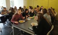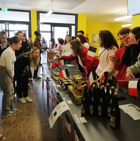 Am Donnerstag waren die Franzosen nur zu Fuß unterwegs, insgesamt 15 km Wegstrecke haben sie gemacht. Am Morgen ging es von der Jugendherberge zu Berufsschule 2. Dort wurden Sie herzlichen von der Stellvertreterin Tanja Zeis und Maria Pauli begrüßt. Ebenso hießen unsere Teilnehmer der Fahrt die französischen Schüler willkommen und in einer Speeddating Runde konnten sie sich gleich ein wenig kennenlernen. Anschließend bereiteten 12 französische Schüler den Verkaufsstand mit typischen französischen Produkten aus der Region Compiègne (z. B. Cidre, Honig, Kerzen, usw.) vor. Diese konnten in der Vormittagspause erworben werden. Nach dem Verkaufsprojekt begrüßte die Schulleiterin Elisabeth Wittmann mit Unterstützung von Herrn Fischer als Dolmetscher die Schüler und Lehrer der Partnerschule. Dabei wurde unter anderem die Schule, die Partnerschaft sowie das deutsche Schulsystem erläutert. Um die Unterschiede selbst zu erleben, hatten die Schüler nun die Gelegenheit, in verschiedenen Unterrichten zu hospitieren. Zum einen bei Frau Fink in Englisch, bei Herrn Fischer in Ethik und bei Frau Pauli in Wirtschaft. Die anderen Schüler konnten ihre Fragen an deutsche Schüler stellen. Beim gemeinsamen Mittagessen mit zwei typischen bayrischen Gerichten, Käsespätzle mit gemischtem Salat und Schnitzel mit Kartoffelsalat, konnten die französischen und deutschen Teilnehmer der Begegnung die Kontakte weiter vertiefen. Unsere Schüler gingen anschließend wieder in den Unterricht oder die Betriebe, während für die französische Gruppe eine Besichtigung der Landshuter Zeitung anstand. Bereits am Vormittag hatten sich unsere Schüler und die französischen Schüler schon gut kennengelernt und für den gemeinsamen Abend Pläne geschmiedet. Nach der Rückkehr in die Jugendherberge wurden die französischen Teilnehmer von unseren Schülern zu Fuß und teilweise mit dem Auto für gemeinsame Ausflüge abgeholt. Die Lehrkräfte beider Schulen aus dem Compiégne Team verbrachten parallel einen sehr gelungenen Abend im Restaurant “Franzz” in der Landshuter Neustadt.