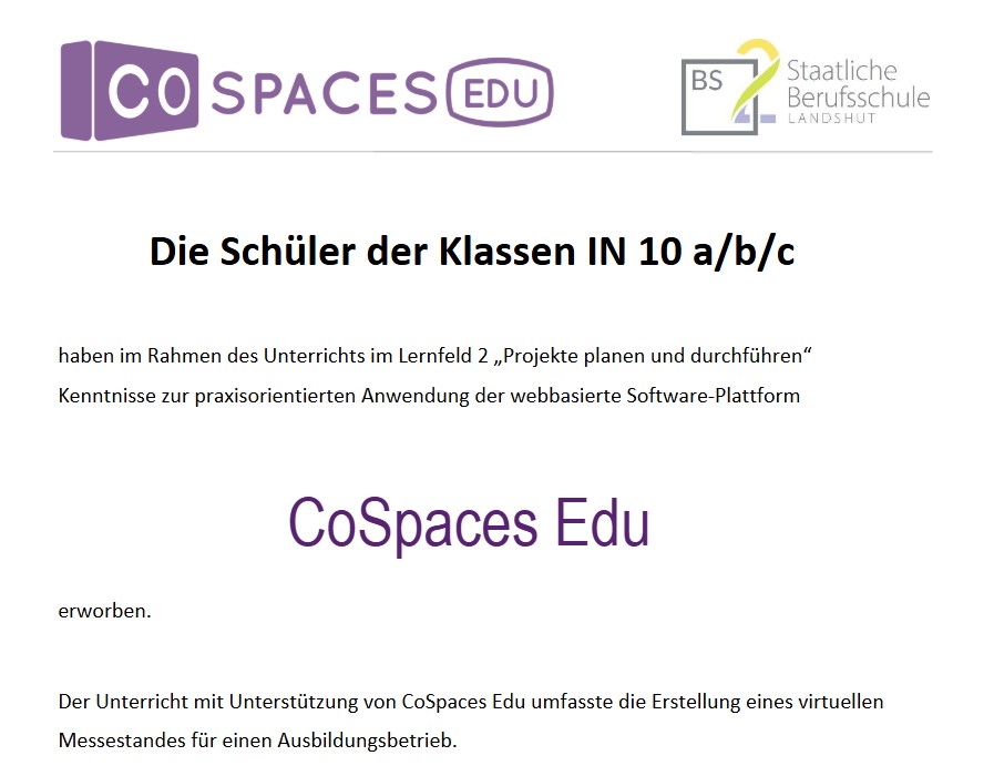 Gemeinsam mit ihren Lehrerinnen Sabine Baumann, Manuela Hobmaier und Tanja Schmid entwickelten die Schülerinnen und Schüler ein Projekt rund um virtuelle Messestände ihrer Ausbildungsbetriebe. Ziel war es, die im Unterricht erarbeiteten Grundlagen des Projektmanagements – von der Planung über die Umsetzung bis zur Präsentation – direkt anzuwenden. Mit großem Engagement und Kreativität erstellten die Teams interaktive, digitale Messestände mithilfe der Software CoSpaces Edu (jetzt: Delightex), die sie sich zusätzlich im Rahmen der Unterrichtsvorbereitung eigenständig aneigneten.