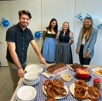 Dass es sich dabei um ein geschätztes Privileg handelt, betonte auch die Schulleiterin, Oberstudiendirektorin Elisabeth Wittmann, als sie den jungen Mann auf der „Bavarian Welcome Party“ begrüßte. Die Idee zu dieser offiziellen Willkommensveranstaltung unter bayerischem Motto kam auf, als Tanja Schmid, Lehrkraft im Fach „PLUS“, den Schülerinnen und Schülern aus der IN 11c von der Fremdsprachenassistenzkraft erzählte. Die Klasse wird von angehenden Industriekaufleuten mit der Zusatzqualifikation Fremdsprachen besucht, deswegen lag es nahe, dass der US-Amerikaner aus Georgia ausgerechnet von diesen Auszubildenden in die Gepflogenheiten der bayerischen Kultur eingeführt wurde.