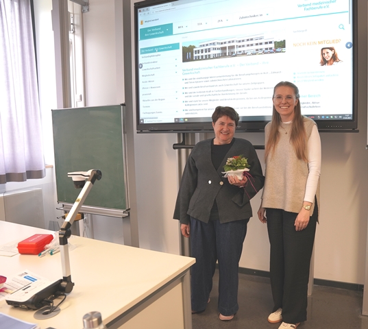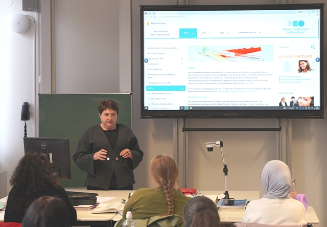 Am Montag, den 31. März, war Frau Renate Krause vom Verband für medizinische Fachberufe, Bezirksstelle Landshut, in den Klassen MFA10a und MFA10b jeweils für eine Doppelstunde zu Gast. Schon seit einigen Jahren ist dieser Besuch fest im Terminplan der Staatlichen Berufsschule 2 verankert, da er den Fachunterricht, insbesondere im Hinblick auf das Thema Tarifverträge, wertvoll ergänzt.