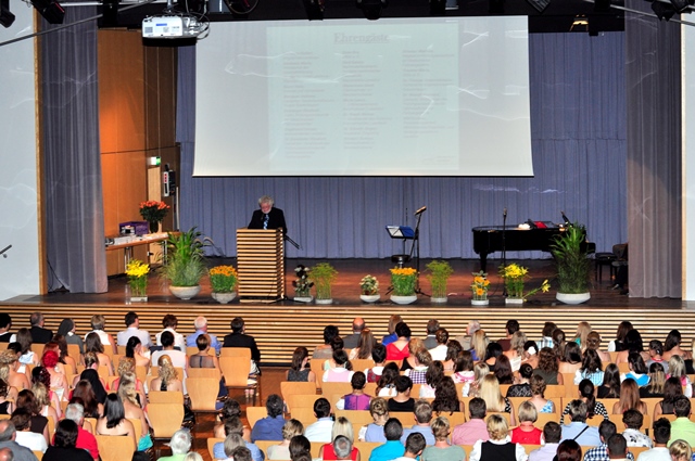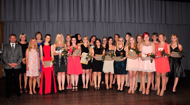 Am Freitag, 25.07.2014, war es endlich soweit: 128 Absolventinnen feierten im Ergoldinger Bürgersaal den erfolgreichen Abschluss ihrer Ausbildung. Die Feier wurde von Religionspädagoge Heinrich Wannisch mit einem geistlichen Impuls eröffnet. Nach der Begrüßung aller Gäste stimmte Heinrich Wannisch zusammen mit seinen Musikerfreunden Klaus Brödl und Rainer Traub sowie Fachoberlehrer Michael Kadach mit dem Lied „On the sunny side of the street“ auf den bevorstehenden Abend ein. Anschließend gratulierte Schulleiter Johann Cikanek den frisch gebackenen Medizinischen Fachangestellten, Zahnmedizinischen Fachangestellten und den Pharmazeutisch-kaufmännischen Angestellten zur ihrer Leistung und wies auf die äußerst guten Berufschancen der jungen Damen hin. Er lobte nicht nur die Ausdauer und Disziplin der Absolventinnen, sondern auch deren Teamgeist und Eigeninitiative – Eigenschaften, die nicht nur unsere Fußballnationalmannschaft zum Weltmeistertitel geführt haben, sondern auch unsere Schülerinnen zu einem erfolgreichen Abschluss der Berufsausbildung. Doch damit allein ist es nicht getan – so ermunterte Johann Cikanek die Damen zu einer konsequenten Weiterentwicklung: „Bleiben Sie einfach immer am Ball.“ Schulleiter Johann Cikanek wies darauf hin, dass sich Investitionen in Bildung immer lohnen – wie man an unseren erfolgreichen Absolventinnen sehen kann – und dankte in diesem Zusammenhang dem Zweckverband berufliche Schulen Landshut. Dessen Unterstützung im Hinblick auf die Erweiterung und Modernisierung der Berufsschule schaffe beste Arbeits- und Lernbedingungen. Des Weiteren sprach Johann Cikanek den Eltern, Ausbildungsbetrieben und Lehrkräften sowie seiner Stellvertreterin Elisabeth Wittmann einen Dank für ihren unermüdlichen Einsatz aus. Im Rahmen dieser Feierlichkeit sprachen die stellvertretende Landrätin Christel Engelhard, der Vorstand des Ärztlichen Kreisverbandes Landshut, Dr. Werner Resch, und Dr. Elisabeth Emslander vom Zahnärztlichen Bezirksverband Niederbayern den Absolventinnen ihre Glückwünsche aus.