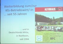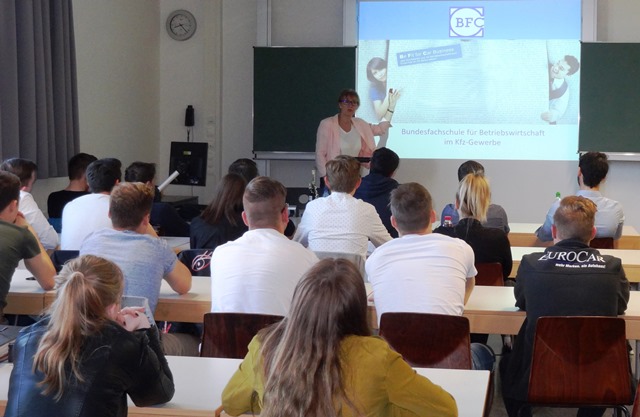 BFC-Absolventen sind dabei erste Wahl nicht nur in Autohäusern, sondern auch bei Herstellern, Importeuren, Autobanken, Mietwagengesellschaften, Online-Plattformen und Software-Unternehmen der Automobilwirtschaft. Sylvia Gerl, Schulleiterin der Bundesfachschule für Betriebswirtschaft im Kfz-Gewerbe (BFC) in Northeim, motivierte auf ihrer jährlichen Berufsschultour unsere angehenden Automobilkaufleute der 10. und 11. Jahrgangsstufen für ihren beruflichen Erfolg im Kfz-Gewerbe. Der Kfz-Betriebswirt kann an der BFC mit abgeschlossener Berufsausbildung auch ohne Abitur sowohl im 11-monatigen Präsenzstudium als auch im 24-monatigen Fernstudium erworben werden. Finanzielle Fördermöglichkeiten bestehen über das Meister- bzw. Aufstiegs-BAföG.