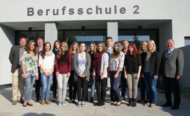 Der Schulleiter Johann Cikanek und Herr Gerhard Ellersdorfer von der IHK-Akademie Niederbayern begrüßen die ersten Industriekaufleute mit Zusatzqualifikation Fremdsprachenkorrespondent/in an der Staatlichen Berufsschule 2. Dabei handelt es sich um ein Aus- und Weiterbildungsmodell, da die Auszubildenden neben der Berufsausbildung zum/zur Industriekaufmann/-frau nach zweieinhalb Jahren auch die Weiterbildungsprüfung zum/zur Fremdsprachenkorrespondent/-in Englisch vor der IHK Niederbayern ablegen.