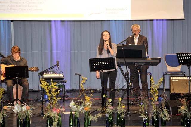 225 Schülerinnen und Schüler konnten im Rahmen eines feierlichen Festaktes im Ergoldinger Bürgersaal ihre Abschlusszeugnisse aus den Händen von Schulleiterin Elisabeth Wittmann und stellvertretender Schulleiterin Tanja Zeis in Empfang nehmen. Die besten Glückwünsche des Landkreises Landshut überbrachte hierbei der stellvertretende Landrat Fritz Wittmann, der in seiner Rede die erbrachten Leistungen von Schülern und Lehrern nochmals besonders würdigte. Dabei stellte er fest, dass die Absolventen mit dem Zeugnis einer „renommierten Schule“ nun „beste Aussichten“ in einer „boomenden Wirtschaft“ hätten. In Vertretung von Oberbürgermeister Alexander Putz gratulierte der 3. Bürgermeister der Stadt Landshut, Erwin Schneck, den Absolventen im Namen der Stadt. Er attestierte den anwesenden Schülerinnen und Schülern, dass sie in den vergangenen Jahren wohl „ziemlich viel richtig gemacht“ haben müssen und lobte „Ausdauer und Engagement“ der Absolventen, die nun mit einem erfolgreichen Berufsschulabschluss belohnt werden. Eine besondere Ehrung nahmen die Landtagsabgeordneten Hubert Aiwanger und Helmut Radlmeier vor, die Patryk Kalogiannis für sein herausragendes Zeugnis einen Staatspreis überreichen konnten. Daneben wurden für hervorragende Leistungen zwei Preise des Fördervereins, elf Buchpreise und eine Auszeichnung im Rahmen des Englischzertifikates vergeben. In gewohnt erfrischender Weise bereicherte die Lehrer-Schüler-Band unter Leitung von Oberstudienrat Manfred Mang wieder die Feierlichkeit.