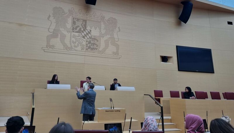 Der nächste Programmpunkt war eine rund einstündige Diskussion mit MdL Ruth Müller im Senatssaal, auf deren Einladung der Landtagsbesuch erfolgte. Da die Schüler bereits im Vorfeld eine Vielzahl an Fragen vorbereitet hatten, mangelte es nicht an Gesprächsthemen. „Wie sieht der Alltag eines Landtagsabgeordneten aus?“, „Wie geht es mit der Digitalisierung in Bayern voran?“ oder „Warum dauern die Sommerferien hier nur sechs Wochen und nicht (wie z.B. in der Ukraine) drei Monate?“ waren nur einige der Fragen, die den Besuchern unter den Nägeln brannten.