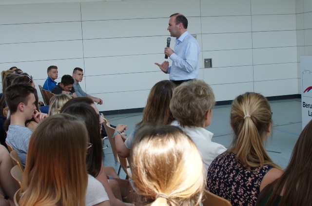 Nach den einleitenden Worten der Schulleiterin Elisabeth Wittmann stellte sich der gebürtige Niederbayer den gespannten Zuschauern vor. Wie andere sich in ihrer Freizeit in einem Verein engagieren, ist sein Leben schon immer die Politik: Vorsitzender der Jungen Union, mit 29 Jahren jüngster Landtagsabgeordneter und mittlerweile schon seit 13 Jahren im Europäischen Parlament. Und hier ist er nicht nur einer von 750 Abgeordneten. Als Fraktionsvorsitzender der EVP-Fraktion gehört Manfred Weber zu den einflussreichsten Politikern auf Europaebene.