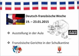 Im Rahmen der deutsch-französischen Woche können sich die Schüler an Stellwänden einerseits über die deutsch-französische Freundschaft und andererseits über die aktuellen politischen Ereignisse in Paris informieren.