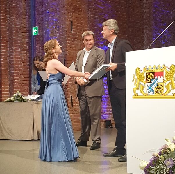 Sie wurde zusammen mit 74 Absolventinnen und Absolventen des Abschlussjahrgangs 2022 vom Bayerischen Ministerpräsidenten Dr. Markus Söder und vom Bayerischen Staatsminister für Unterricht und Kultus, Prof. Dr. Michael Piazolo, dafür ausgezeichnet, dass sie neben einem hervorragenden Schulabschluss auch soziales und ehrenamtliches Engagement zeigte.