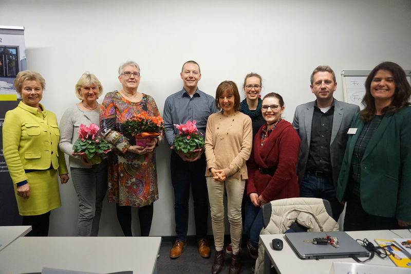 Von links: Schulleiterin Elisabeth Wittmann, die stellvertretende Elternvertreterin Christine Lohse, die scheidende Elternvertreterin Daniela Welzel, der neu gewählte Elternvertreter Markus Kopp, JAS-Sozialpädagogin Gabriele Stübinger, Veronika Pauli und Elisa Krimbacher von der vhs Landshut und Mathias Berger von der IHK.