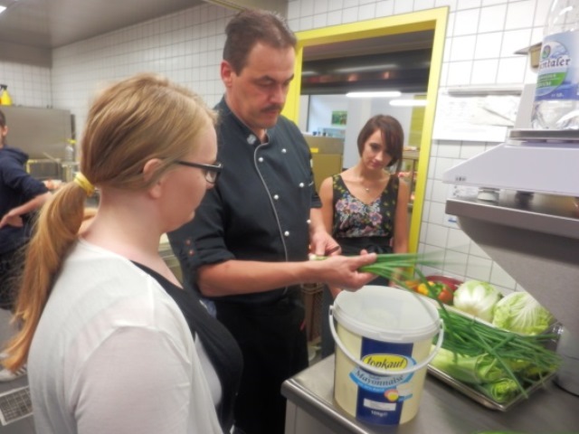Um 08:30 Uhr war es soweit: Werner Zehetbauer, Küchenchef und Betreiber der Schulmensa erklärte uns die Hygienevorschriften und die Arbeitsabläufe einer Mensa. Dann durften wir auch gleich aktiv im Servicebereich arbeiten.