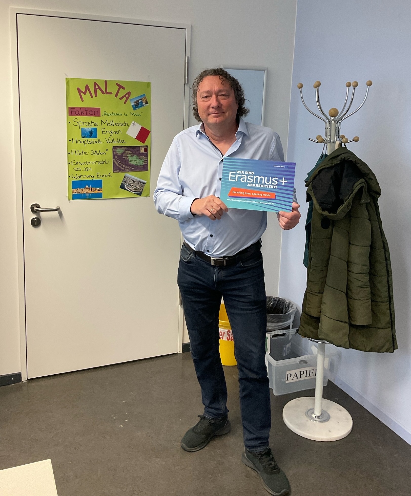 Mit der Akkreditierung kann die Schule künftig regelmäßiger Fördermittel beantragen, Mobilitätsprojekte verlässlich planen und ihre internationale Vernetzung gezielt stärken. Das verliehene Schild wird gut sichtbar im Schulhaus angebracht und soll Lernende, Mitarbeitende und Partner zu neuen europäischen Lern- und Kooperationsvorhaben ermutigen. Wir danken StD Thomas Forster und seinem Internationalisierungsteam für das Engagement und die aktive Mitarbeit am Gelingen zahlreicher Erasmus+ Mobilitäten.