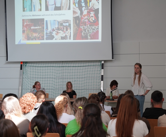Neben der Schulorganisation und ihrer wichtigsten Personen standen die zahlreichen Schulaktivitäten, wie z. B. Auslandspraktika in Malta und Dublin, praxisorientierte Unterrichtsprojekte und soziales Engagement im Mittelpunkt der einstündigen Veranstaltung. Auch das Beratungsteam der Schule informierte aus erster Hand über die vielen unterschiedlichen Unterstützungsmöglichkeiten vor Ort. So stellten Beratungslehrerin Birgit Volquardsen, Schulpsychologe Bernhard Selmaier sowie JAS-Sozialpädagogin Gabriele Stübinger ihr jeweiliges Aufgabengebiet vor. Die bisherige Verbindungslehrerin Tanja Schmid informierte über die SMV und deren Engagement in den letzten Schuljahren.