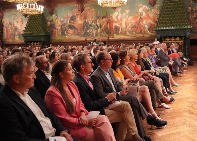 Für 286 Absolventen der kaufmännischen Ausbildungsberufe unserer Schule fand am 17.07.2024 im festlichen Ambiente des Rathausprunksaals die Abschlussfeier statt. Erfreulich viele Angehörige unserer Abschlussschüler waren gekommen, konnten aber leider teilweise nur auf Stehplätzen die Verabschiedung miterleben.