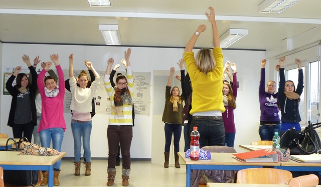 Die Klasse KfB 11 a erreichte mit ihrer Lehrerin, Studienrätin Veronika Graf, bayernweit den 1. Platz beim Kreativpreis, der mit 750,00 € dotiert war. Während der Projektdauer von vier Wochen begann die Klasse jeden Schultag mit verschiedenen 5-10-minütigen Übungen zur Rückengesundheit. „Es sind ganz einfache Übungen, ohne viel Aufwand, die man auch mal schnell in der Arbeit anwenden kann“, erklärte eine Schülerin. Die Übungen wurden vom jeweiligen Schüler-Trainerpaar zuhause vorbereitet und dann zusammen mit der ganzen Klasse durchgeführt. Dabei waren abwechselnd jeweils zwei Schüler als Fotograf aktiv. „Die Rückengymnastik war sehr abwechslungsreich, da sie sowohl im Stehen und Sitzen, als auch mit und ohne Hilfsmittel, wie z. B. Wasserflaschen, Stühlen oder Ordnern, stattfand“, so eine Teilnehmerin. Es wurden auch Partnerübungen gemacht. Die Trainingseinheiten bestanden aus Dehn-, Ausdauer- und Kräftigungsübungen. Während der vier aktiven Wochen wurden die Übungen in einer Fotodokumentation und einem Video zusammengefasst sowie im Anschluss mit Musik hinterlegt. Außerdem verfasste die Klasse einen Bericht über die Planung, Durchführung und Reflexion des Projekts. Die Klasse ist dem Projekt sehr offen gegenüber getreten: „Durch die morgendlichen Übungen wurden wir wach und hatten gleich noch Spaß. Unsere Klassengemeinschaft wurde noch besser“. Zudem hat die Aktion auch im Büroalltag der Auszubildenden einen Platz gefunden. Im Fall von Rückenschmerzen haben die Schüler nun immer die passenden Übungen parat. Eine Schülerin meinte: „Wer hätte das gedacht, dass ein ganz normaler Schulordner oder eine Wasserflasche unserem Rücken so gut tun können?“