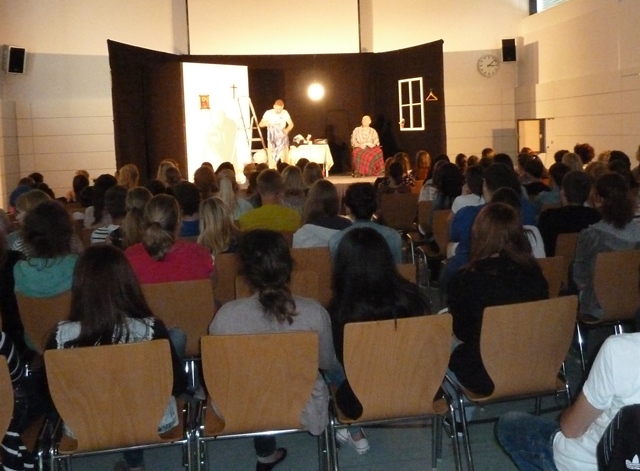 Freiwillig gehen Jugendliche ja eher ungern auf alte Menschen zu. „Die verstehen uns ja eh nicht und sind uncool“… Obwohl unsere Schüler in den allermeisten Fällen Omas und Opas haben und lieben, gibt es das Vorurteil der vertrottelten Alten. Das Stück zeigt auf humorvolle und an-sprechende Weise, dass das nicht so sein muss, dass es großartige Chancen und Möglichkeiten gibt, wenn Jung und Alt zusammenhalten. Vielen Dank und großes Lob an die Schauspieler Gernot Ostermann und Daniel Zimpel. Das Stück wird unseren Jugendlichen sicher noch lange in Erinnerung bleiben.