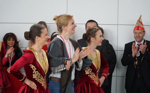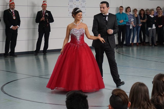 Der Prinzenwalzer des diesjährigen Prinzenpaars, Ihrer Lieblichkeit Prinzessin Angela I. und Seiner Tollität, Prinz Mimmo I., zu Ed Sheeran und Andrea Bocelli berührte sicherlich nicht nur die Schülerinnen. Besonders beeindruckt waren alle von der Showtanzeinlage zu „Magic“ mit ihren zahlreichen Hebefiguren, durch die sogar die schlichte Kulisse der Turnhalle etwas verzaubert wurde. Für ihren begeisterten Applaus wurden die Anwesenden zum Schluss noch mit einer Zugabe der Garde und einem kräftigen „Helau“ belohnt.