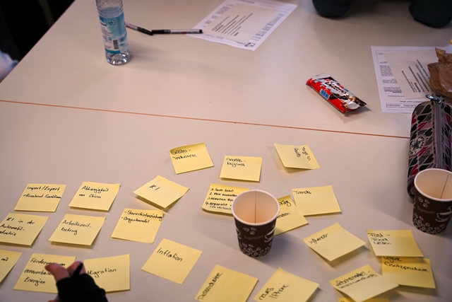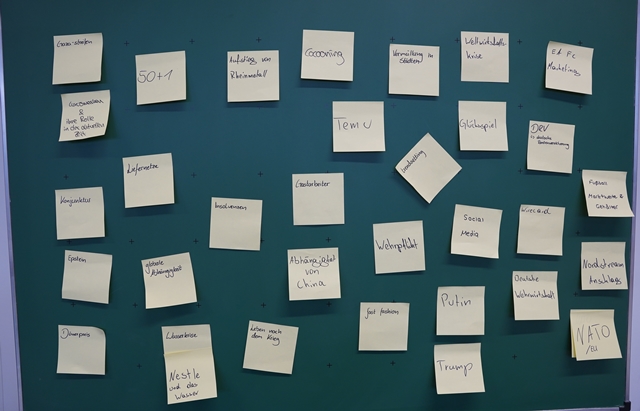 Ein zentraler Bestandteil des Tages war die gemeinsame Themenentwicklung. Mit kreativen Methoden wie beispielsweise Brainstorming mithilfe von Post-its erarbeiteten die acht Projektgruppen jeweils einen Themenpool. Im Anschluss stellte jede Gruppe ihr favorisiertes Thema in einem Pitch vor. In kurzen Fragerunden erhielten die Gruppen direktes Feedback, das ihnen bei der Schärfung und Konkretisierung ihrer Themen in den nächsten Wochen helfen wird.