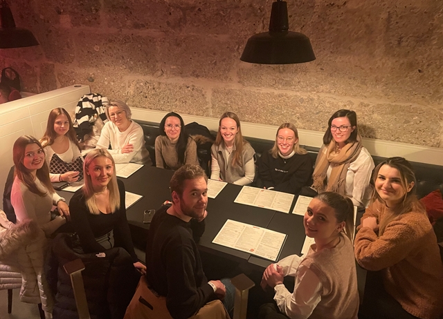 Am Montagmorgen trafen sich alle Mitreisenden bestens gelaunt am Landshuter Bahnhof. Nach ca. 2,5-stündiger Zugfahrt erreichte die 28-köpfige Reisegruppe den Hauptbahnhof in Salzburg. Gemeinsam machte sie sich anschließend auf den kurzen Fußmarsch zur Unterkunft, um dort einzuchecken und das Gepäck abzugeben. In Kleingruppen erkundeten die Schülerinnen und Schüler mittels interaktiver Führung per Smartphone die Innenstadt und genossen dabei das vorweihnachtliche Salzburg. Anschließend stand etwas Zeit zur freien Verfügung auf dem Programm, ehe man den ersten Tag bei einem gemeinsamen Abendessen in entspannter Atmosphäre ausklingen ließ.