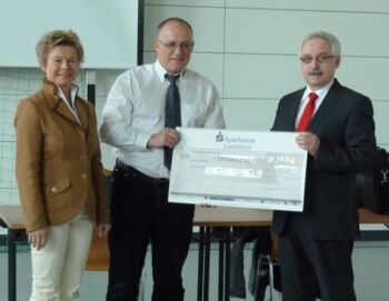 Im Rahmen der Auftaktveranstaltung der diesjährigen Ostbayerischen Verkehrssicherheitsaktion der Verkehrswacht vom 13. bis 17. März 2017 wurde Ulrich Deser, der zweite Vorsitzende der Verkehrswacht, mit einer erfreulichen Spende überrascht. Thomas Joos, Sprecher der Sparkasse Landshut, überreichte ihm einen symbolischen Scheck über 1.000 € zur Finanzierung der Vortragswoche an der Berufsschule 2 und den anderen Landshuter Schulen.